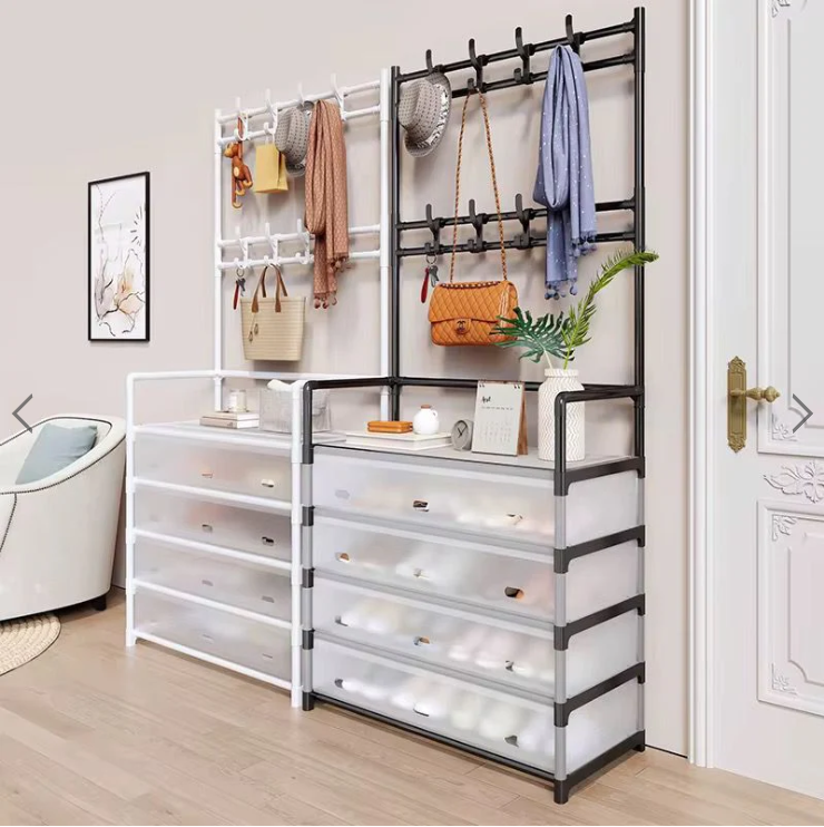 Cuier cu raft pantofi pe 4 niveluri si 8 carlige duble, suport haine si incaltaminte pentru hol