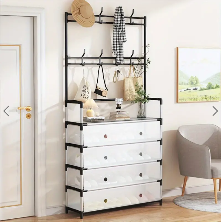 Aceasta etajera pentru pantofi combina perfect 3 functii intr-un singur produs: port-manteau, etajera pentru incaltaminte si raft de depozitare. Designul compact si versatil este ideal pentru holuri, apartamente, garsoniere, dormitoare, dressing sau chiar spalatorie, oferind o solutie practica pentru spatii mici.